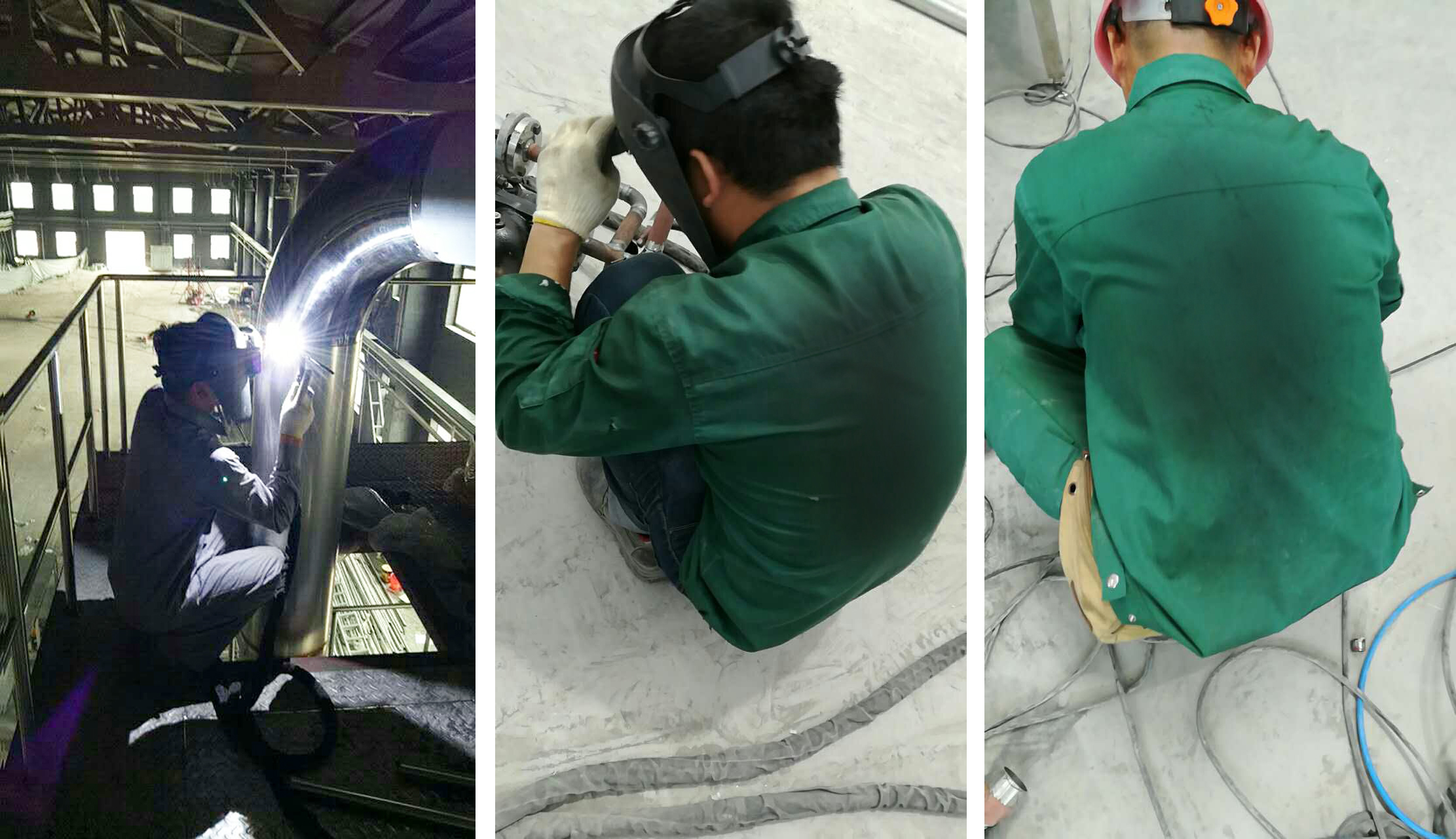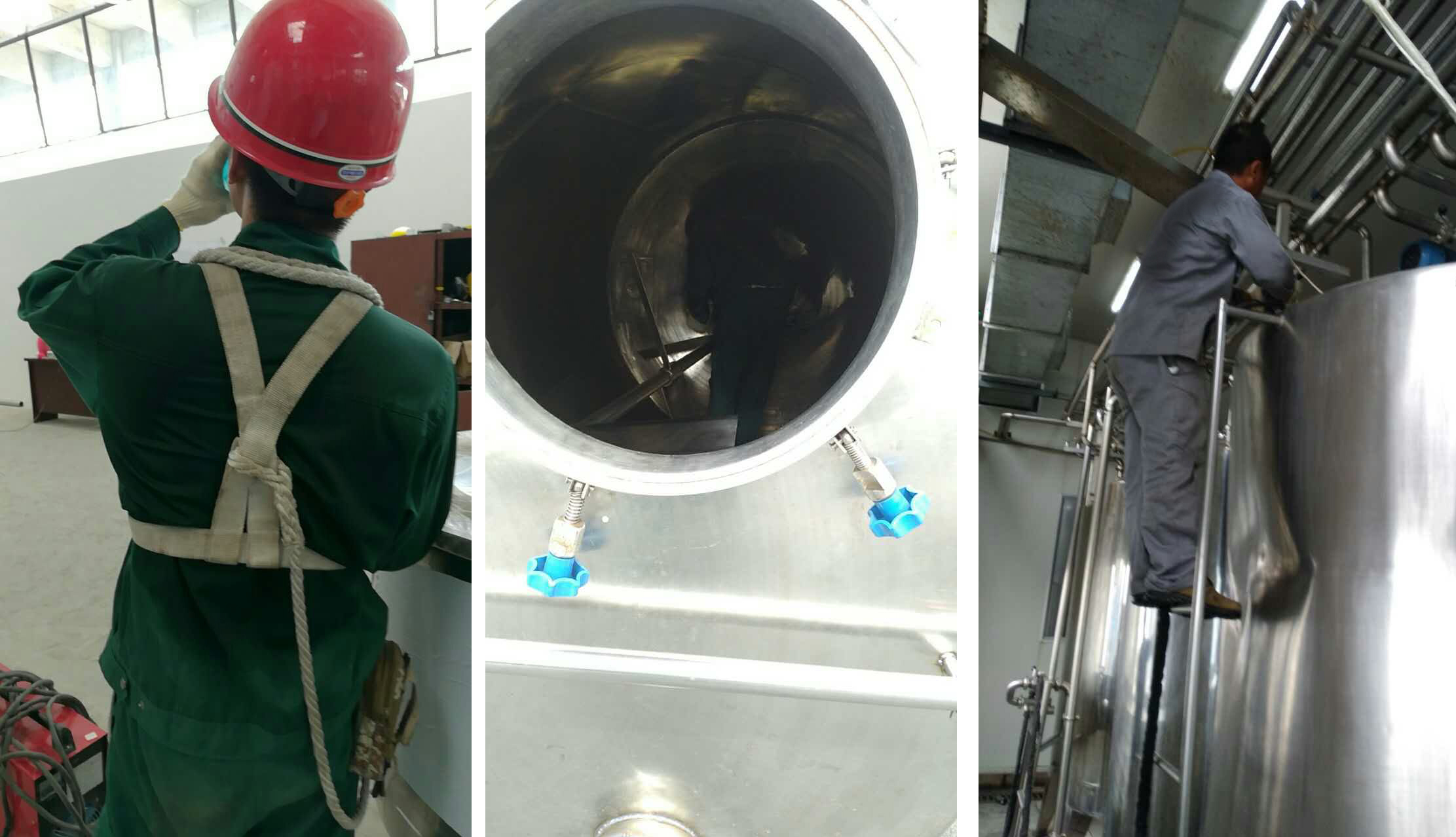 高溫下的不銹鋼表面就像是燒熱的烤板,碰在上面,就是強烈的燒灼感;在通風(fēng)條件差的罐內(nèi)溫度明顯比罐外又要高出幾度。汗水浸濕了衣衫,手上的工作仍在繼續(xù),因為,按時交貨、如期完工,是我們的承諾。