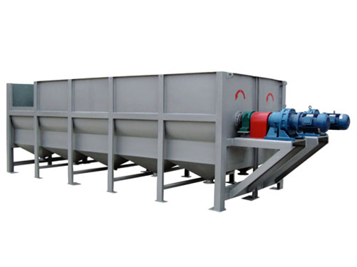 物料由一側(cè)進(jìn)入清洗機(jī),槳葉由電機(jī)帶動(dòng)旋轉(zhuǎn),對(duì)物料進(jìn)行攪拌、清理,同時(shí)將物料由一側(cè)推向另一側(cè),完成一個(gè)清洗周期。